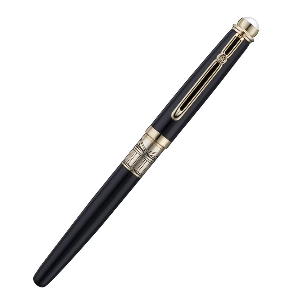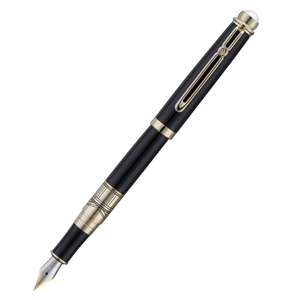 Royal Pearl to eleganckie pióro wieczne inspirowane klasycznym stylem królewskich przyborów piśmienniczych. Głęboka czerń korpusu połączona ze złotymi akcentami tworzy ponadczasową kompozycję, a dekoracyjny perłowy element na topie skuwki nadaje całości wyjątkowego charakteru.